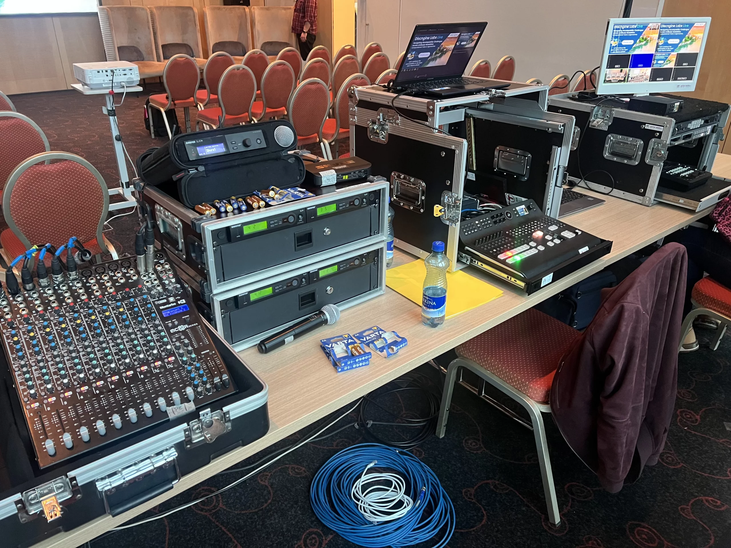 Côté audio, nous avons déployé une sonorisation adaptée comprenant deux enceintes, six micros HF ainsi qu’un pupitre, tout en assurant la gestion du son pour une diffusion optimale à la fois en salle et sur le live.
